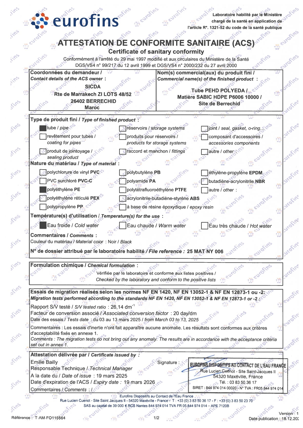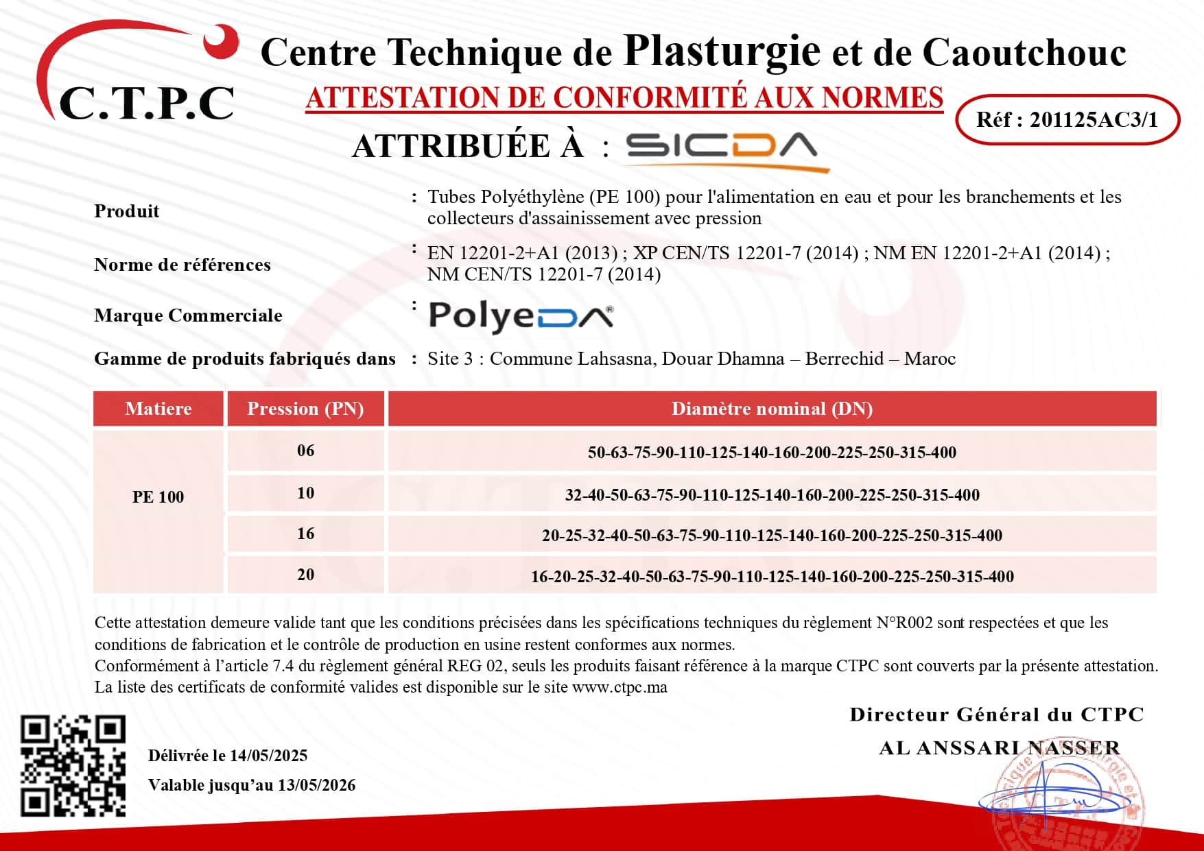 Attestation de Conformité CTPC SICDA PE 100 POLYEDA